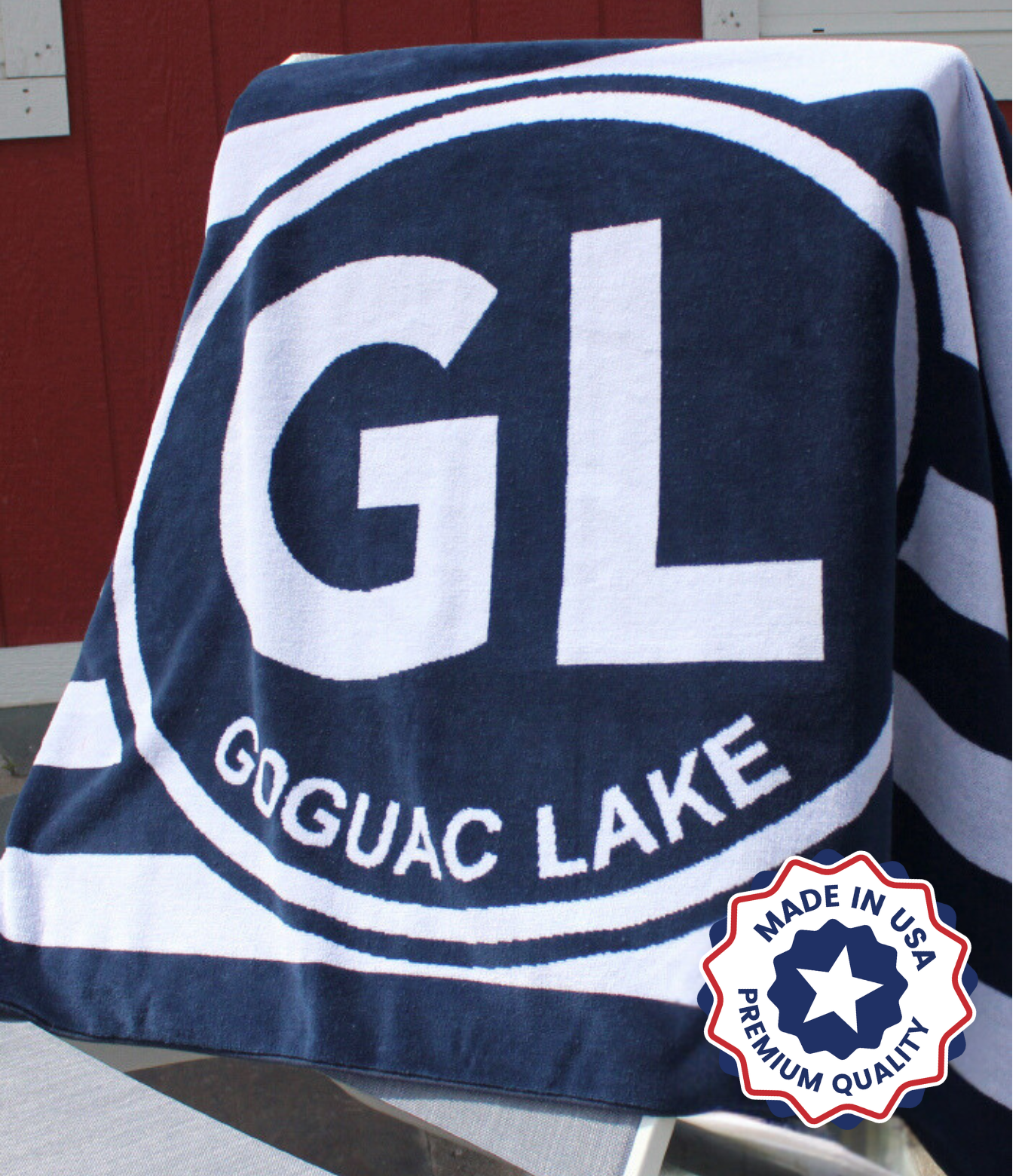 Goguac Lake beach towel in navy blue stripe.