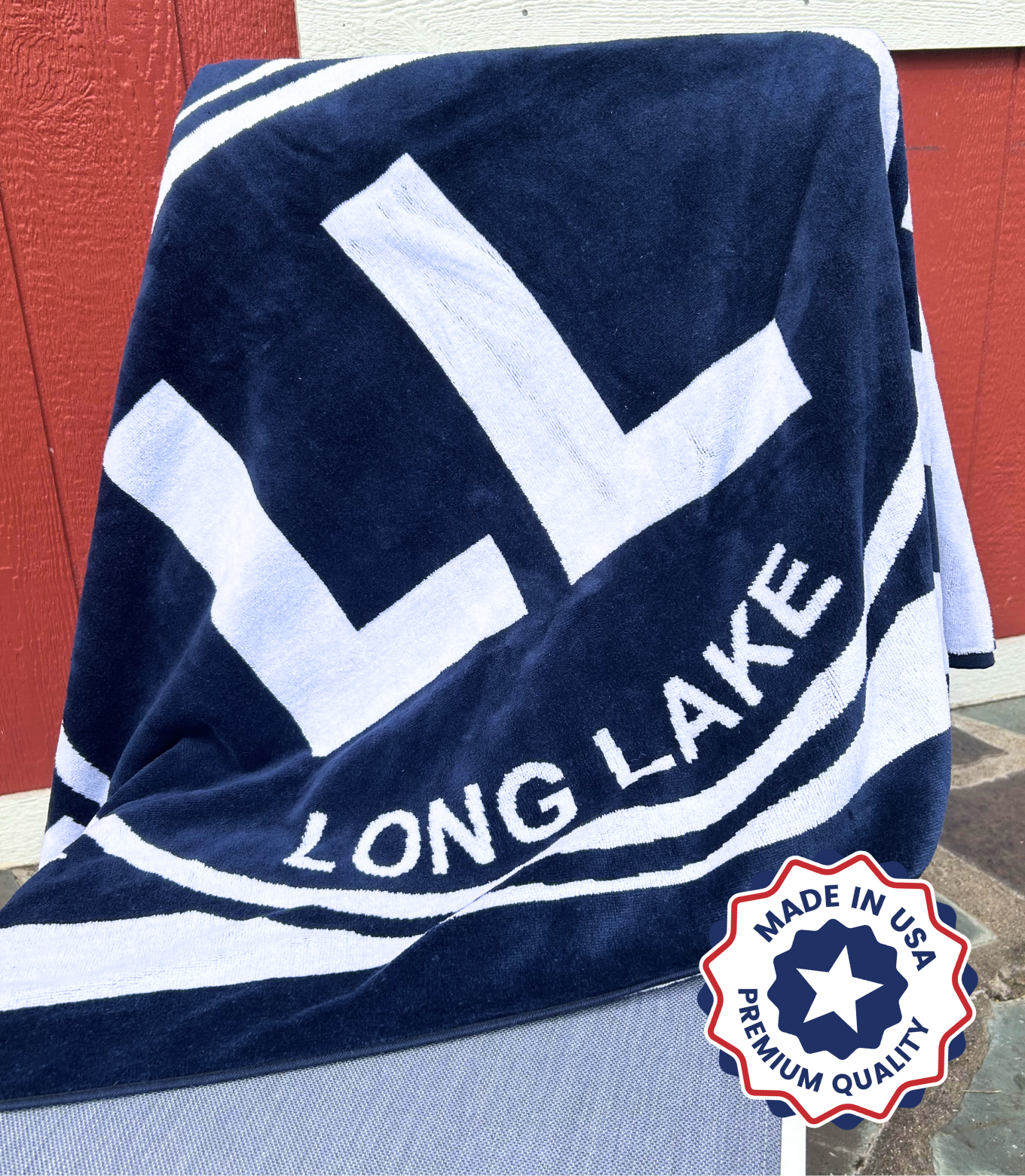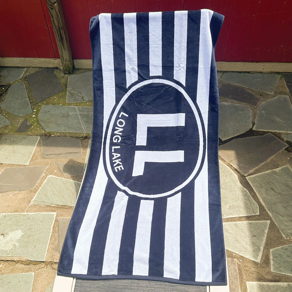Long Lake beach towel in navy blue stripe.