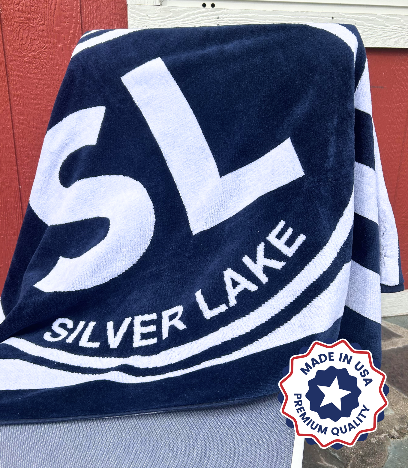 Silver Lake beach towel in navy blue stripe.